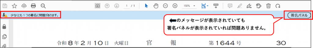 官報には文書の真正性と完全性を示す「電子署名・タイムスタンプ」が施されています。